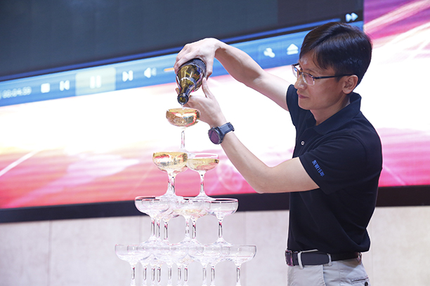 庆祝的香槟让晚宴气氛掀起一个新的小高潮。大家欢呼声不断!