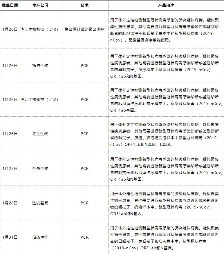 诊断试剂盒属于三类医疗器械,一般要经过临床实验、药监局审批、招标采购等流程才可以进入医院流通,正式出具有临床效力的诊断报告。随着新冠疫情的进一步爆发,大批疑似或潜在感染者需要迅速得到诊断以采取必要措施。为了进一步增强新型冠状病毒核酸检测试剂供给能力,国家药品监督管理局启动《医疗器械应急审批程序》,开通审批绿色通道。截至1月31日,国家药监局已紧急审批通过7个新型冠状病毒核酸检测试剂盒。