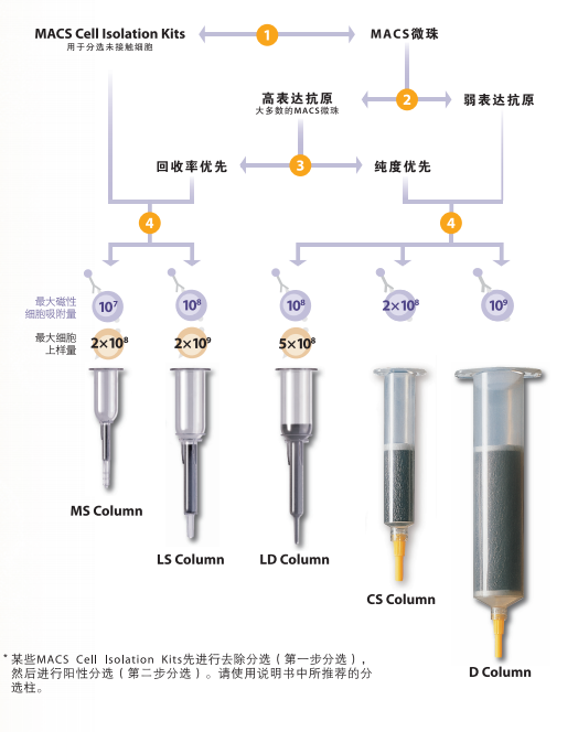注意:某些MACS Cell Isolation Kits先进性去除分选(第一步分选),然后进行阳性分选(第二步分选)。请使用说明书中推荐的分选柱。