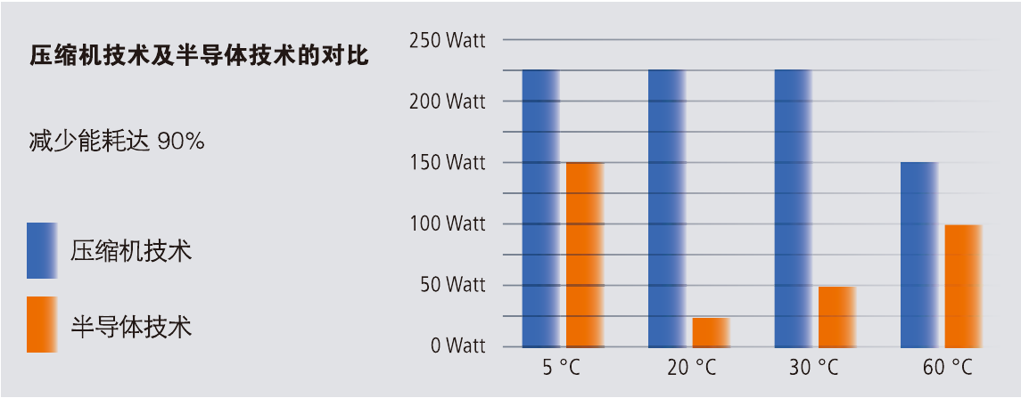 半导体技术与使用压缩机相比,在运行时振动很小且安静,比压缩机制冷技术节省多达90%的能耗,如下图所示。