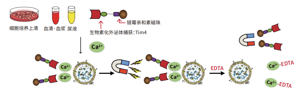 利用这一原理,Wako和金泽大学医学系免疫学华山教授共同开发一款划时代的外泌体提取方法,利用Tim4固化磁珠,在钙离子存在下捕捉培养上清和血清等样品中的外泌体,再添加螯合剂从而提取外泌体[9]。并且MagCapture™外泌体提取试剂盒PS实现了比传统的外泌体纯化法更加简单地提取高纯度完整状态的外泌体。