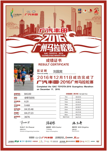 人生就是一场马拉松,他不在于瞬间的爆发,而取决于途中的坚持。很多时候,成功就是多坚持一分钟,只是我们不知道,这一分钟会在什么时候出现。一项赛事的冠军一定属于冲破所有人的极限,最终坚持到终点的人。广马跑到三十五公里,体能达到极限,每向前迈一步,都想着下一步放弃!但理智告诉我:如果这次不坚持!以后就永远不会坚持!