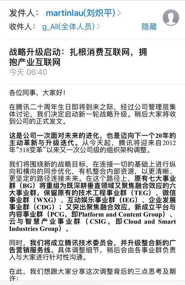 2018年9月30日早上6:40,刘炽平宣布腾讯启动新一轮战略升级,进行第三次架构调整,主题:扎根消费互联网,拥抱产业互联网。